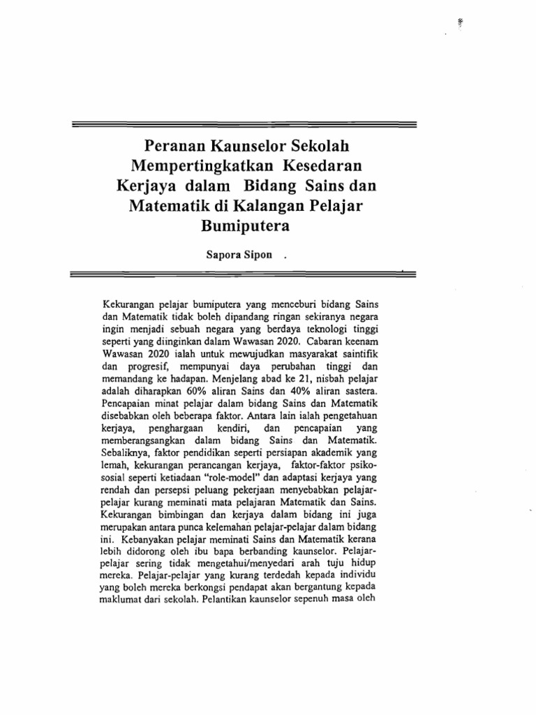 Peranan Kaunselor Sekolah Mempertingkatkan Kesedaran Kerjaya Dalam Bidang Sains Dan Matematik Di Kalangan Pelajar Bumiputera