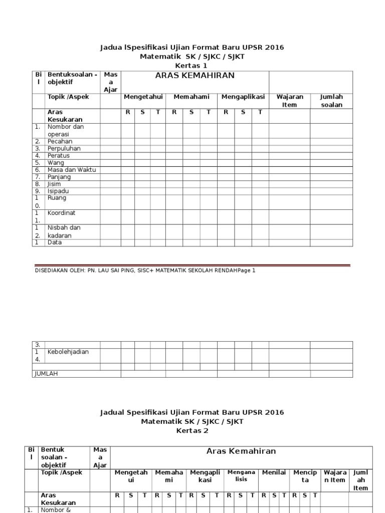 Jadual Spesifikasi Ujian Format Baru Upsr 2016 Jsu Baru 2 Docx